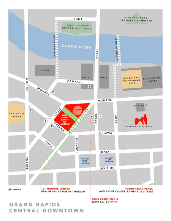 It didn’t take long for Calder’s La Grande Vitesse to become the most popular art work in town. Indeed, the courtyard where the stabile went up is now called “Calder Plaza.” The map above indicates the stabile’s central location in downtown Grand Rapids. It also highlights The Wege Foundation’s Arts & Culture feature story: the new Grand Rapids Art Museum.